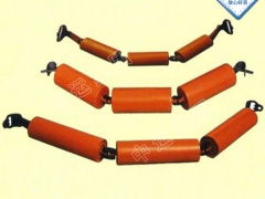 吊挂托辊组的结构特点是其构成托辊之间为柔性联接,托辊组通过抓手可与槽钢、钢 管等刚性机架挂接,也可以与钢丝绳柔性机架挂接。抓手可以是刚性的,也可以是柔性的 ,其结构不同,成弧特点也不同。承载托辊一般三至五节,节数越多,柔性越好,成弧性也就越好。zy17