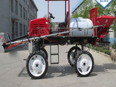 方向盘自走式喷药机 喷杆宽度为4米、6米两种规格,可以升降和折叠,喷杆可进行三段折叠,后轮轮距120-170cm可调,高度可以调节20cm-220cm,4个档位:1档 2档 空挡 倒档,10个喷头。